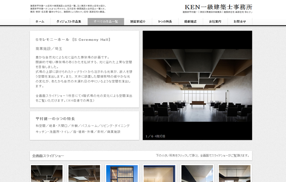 HP更新のお知らせ 最新情報 2015年05月08日 ホームページ更新のお知らせです。 大分更新が遅れてしまっておりましたが、「H社新事務所棟」「Sセレモニーホール」の2物件をホームページに追加しました。Sセレモニーホールでは式場のうつろう光の演出をムービーでご覧頂けます。ぜひご覧ください。souhei