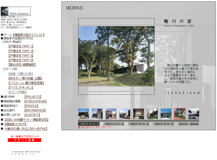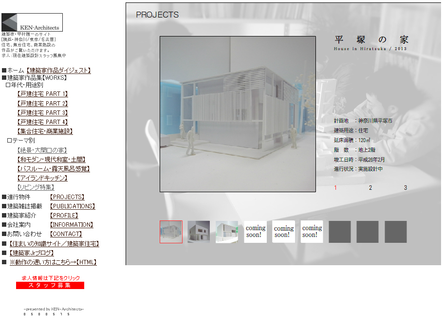 スマートフォン専用ホームページ 最新情報 2013年01月15日 前々から事務所内で企画案が持ち上がっていたというスマートフォン専用のホームページを仮アップデートしました。スマートフォンから弊社ホームページのURL(http://www.ken-architects.com)にアクセス頂くと自動転送で専用ホームページをご覧頂ける設定となっております。まだまだ作成の途中のため、掲載作品も少なく不具合などあるかもしれませんが、近日中には完成版をご覧頂けるかと思います!よろしければご覧ください。mogi