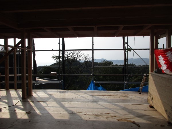 材木座の家(3) 最新情報 2017年10月12日 材木座の家は上棟を迎えました。山の頂上に建つ姿は圧巻です。 ここからは外壁・サッシ・屋根の外廻りから徐々に進んでいきます。 完成したリビング越しに富士山や桜を望む日が楽しみです◎mogi