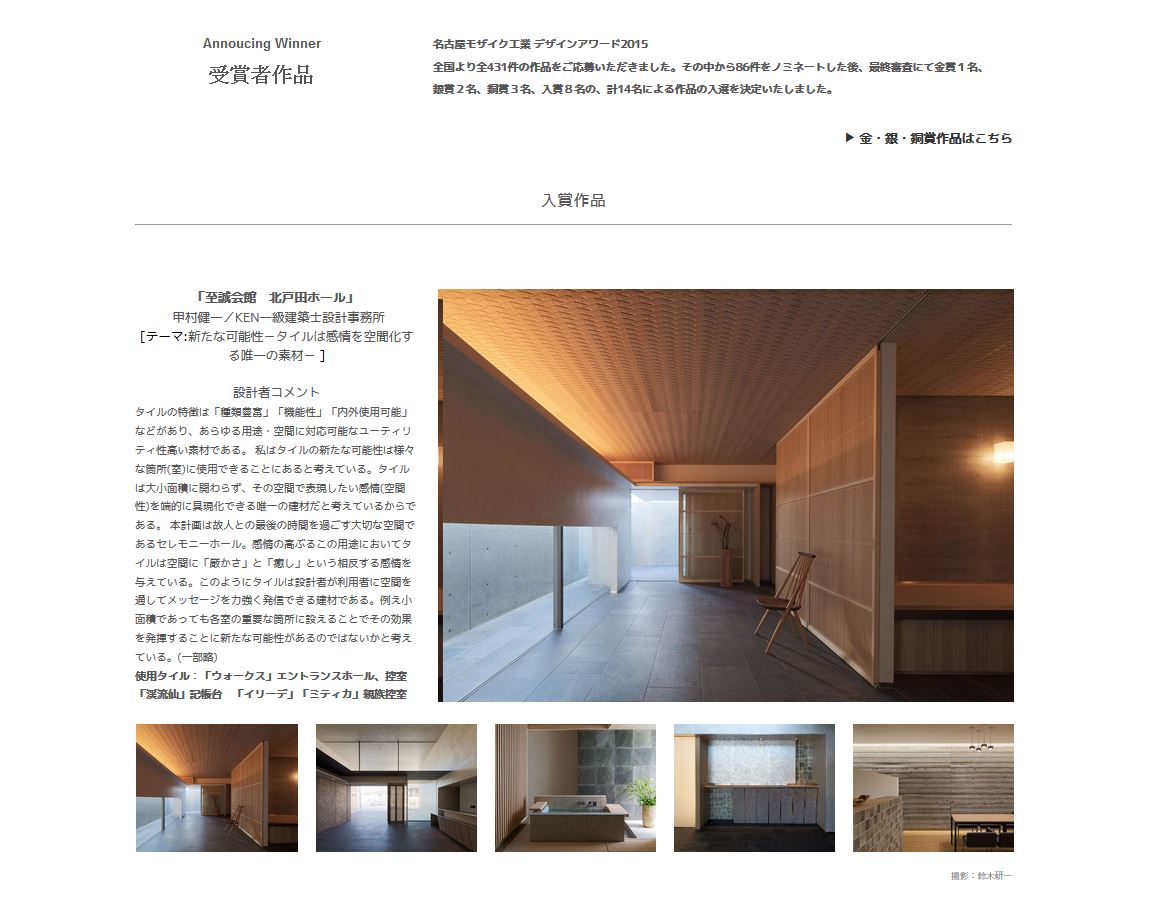 名古屋モザイク工業 デザインアワード2015 最新情報 2016年06月17日 担当物件のSセレモニーホール(至誠会館 北戸田ホール)が名古屋モザイク工業 デザインアワード2015で入賞いたしました。 タイルの使い方や表現方法を競うフォトコンテストです。全国から431件の応募があり、その中から選ばれたことはとても光栄なことです。頑張ってきてよかったです。受賞者ホームページはコチラsouhei