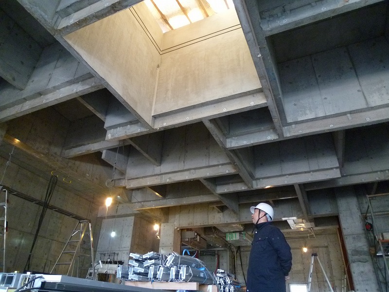 Sセレモニーホール(7) 現場報告 2014年12月06日 RC躯体の養生がはずれ、建物の躯体が全て出来上がりました。4階式場は形状的にこだわって計画しています。 それぞれの幕板が構造的は梁として機能しています。 中央には大きなトップライトがあり、自然光を大きく取り込むことが出来ます。完成が非常に楽しみです。souhei