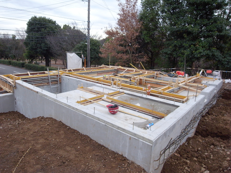 中川の家(7) 現場報告 2014年12月02日 中川の家は地階のコンクリート打設が行われました。 ミキサー車からポンプ車へコンクリートを移し、型枠内へ流し込んでいきます。型枠内の隅々に行きわたるよう、型枠をカンカンと叩くことでジャンカなども防いでいきます。型枠がはずれ形が現れるのが楽しみです◎mogi