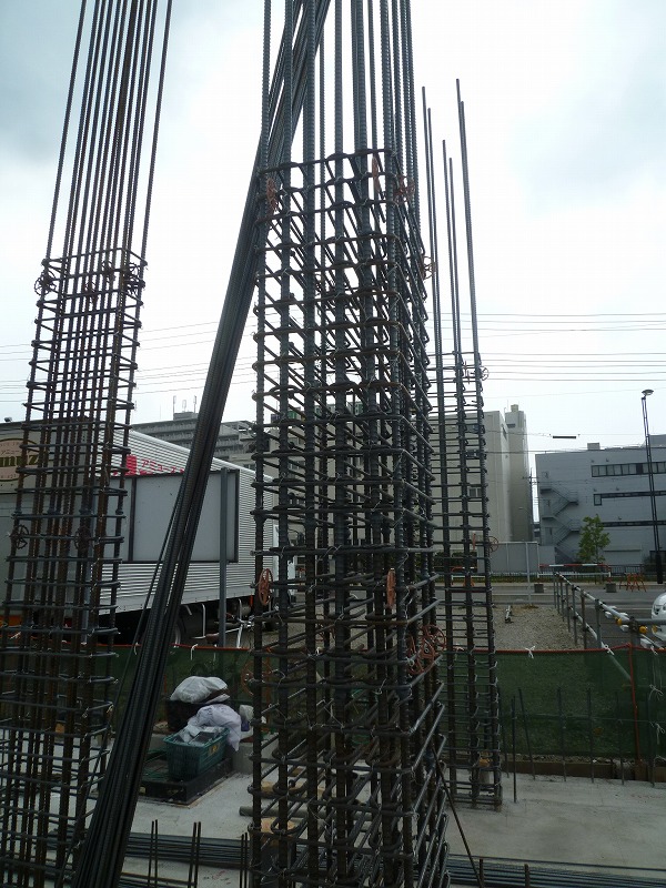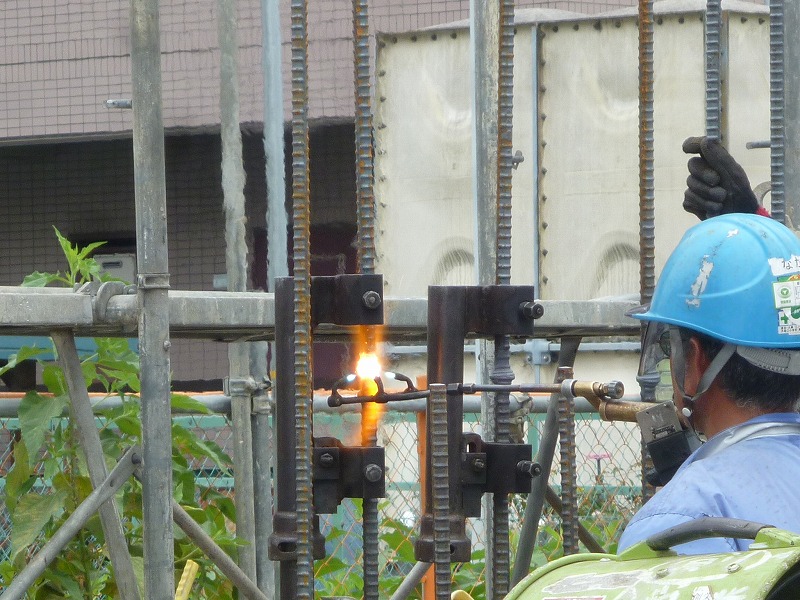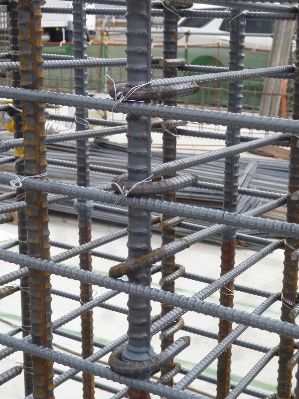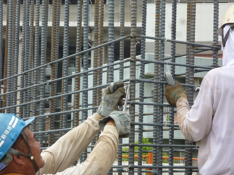 Sセレモニーホール(5) 現場報告 2014年08月15日 暑い、暑い日が続いておりますが、現場は休むことなく動いています。1階立ち上がり部分の鉄筋を組んでいる作業を行っています。 鉄筋同士を圧接して長くしていきます。火を使うので職人さんもかなり暑い。 鉄筋を組んでいきます。位置を固定するのは手仕事です。 非常に美しく、配列が整っています。しばらくしたら、コンクリートで見えなくなってしまう鉄筋ですが、骨組みまできれいにつくられています。 今しか見れない風景です。souhei