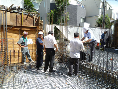 代々木の家(7) 現場報告 2012年09月17日 代々木の家、現場報告です。現場では、配筋工事が終わり先日弊社と構造設計者による配筋検査が行われました。「鉄筋コンクリート造」の「鉄筋」にあたる大切な部分なので間違いがないか要チェック。継手長さは確保できているか…鉄筋相互の間隔や本数はあっているか…などなど次は、「鉄筋コンクリート造」の「コンクリート」にあたる工事。コンクリート打設工事に入ります。MIZUNO