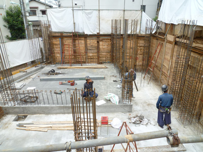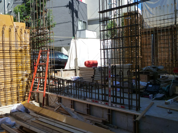 代々木の家(8) 現場報告 2012年09月25日 代々木の家、現場報告です。現場では、コンクリートの打設工事が終わりRCのスラブまでが終わっています。現場では、コンクリートの型枠を外す工事や柱の配筋工事を行っています。なんとなく形が見えてきました!次は、RC壁の配筋工事に入ります。MIZUNO