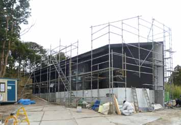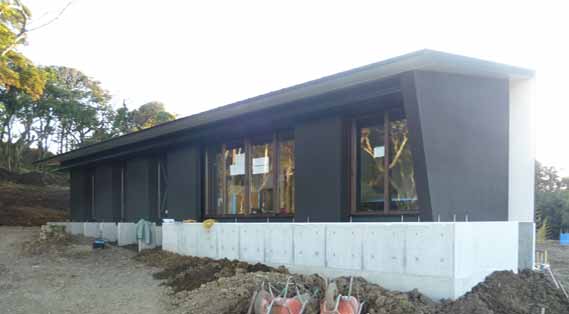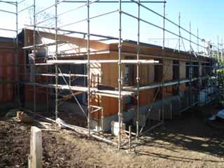 鴨川の家(13) 現場報告 2011年10月31日 現場では、外壁の合板が張り終わりました。今回は、外壁を塗り壁仕上げとするため、今後は、この合板の上に防水紙+ラスモルタルを施し仕上げ材の吹きつけとなります。by koji