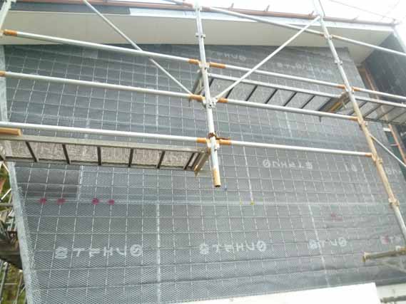 鴨川の家(14) 現場報告 2011年11月15日 現場では、外壁下地のラス網張りが進んでいます。ラス網には、合板とその上に塗るモルタルとを頑丈にくっつける役割があります。先日、そのラス網が合板にしっかりとまっているかのチェックをしてきました。一個一個タッカーで指定の位置にとまっているか全数をチェックします。なかなか骨の折れる作業です。by koji
