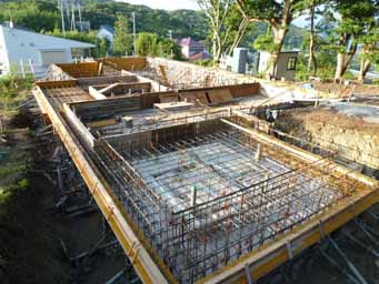鴨川の家(3) 現場報告 2011年08月08日 現場では、基礎の配筋作業が進んでいます。土地に傾斜があるため、基礎底盤に段差のある形状としています。今後は、型枠を組みコンクリートの打設を行います。by koji