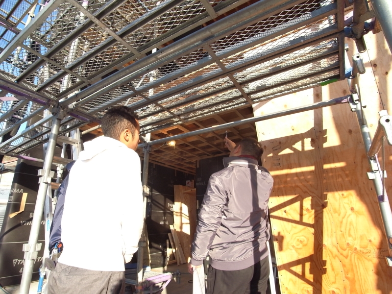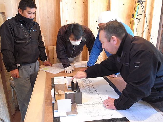 材木座の家(8) 現場報告 2018年02月07日 2月になりました。完成まであと3か月程度。現場か忙しく動いています。現場の定例では、設計の意図を説明し、監督さん・大工さんが実際に作るための細かな打合せをしています。数ミリ単位の仕上がりの調整が必要なので、気が抜けません。souhei
