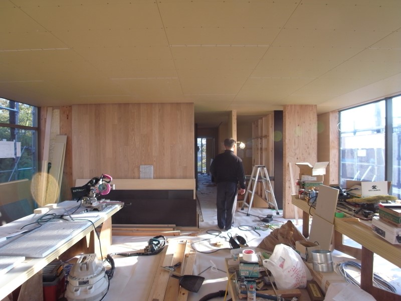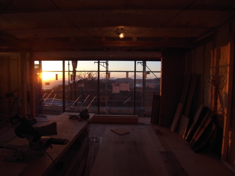 材木座の家(5) 現場報告 2017年12月20日 材木座の家は順調に施工が進んでいます。サッシのガラスがすべて入り、寒波による強風もしのげるようになりました。 しかし、最後の最後まで検討することは山のようにあります。現場に通い、各業者さんと美しく仕上げる方法を相談しながら進めていきます。この積み重ねが最終的に綺麗な空間へと繋がるのだと直に学ばせてもらっています。このライブ感が個人的には憧れる瞬間です。 リビング越しの富士山と冬の西日がとても綺麗でした◎mogi