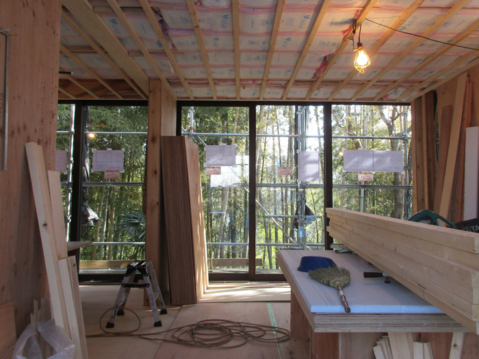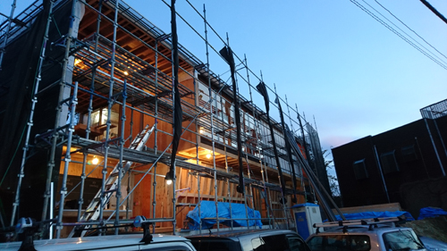 材木座の家(6) 現場報告 2017年12月23日 着々と現場が進み、メインの開口部ができてきました。夕方になると現場の照明がうまい具合に建物をライトアップしています。 職人さんがわざと綺麗になるように配置しているのかなと思うぐらいです。完成が楽しみです。souhei