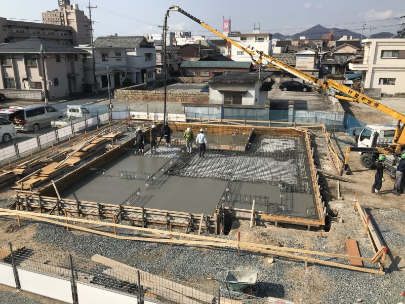 防府の家(8) 現場報告 2018年02月12日 防府の家はいよいよ着工し、土工事・鉄筋工事・基礎工事が順調に進捗しています。 写真のように鳥瞰から見ると周辺建屋に比べてとても広い!地盤面を含めた平屋ならではの広がりがとても期待できます。上棟が一層楽しみになりました◎mogi