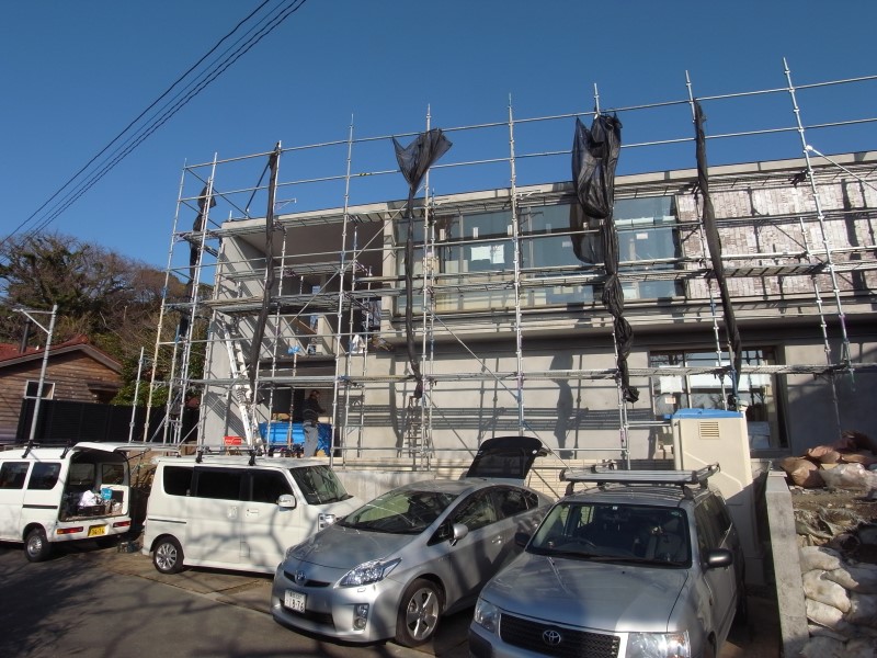 材木座の家(7) 現場報告 2018年01月17日 現場の下地工事も大詰め段階です。急ピッチで現場が動いています◎外部ではとうとう仕上げ材のタイルが貼られていました。 等間隔で美しく貼られています。一枚一枚表情の異なるタイルが綺麗です◎主寝室から見た竹林は、朝日に照らされ、美しい借景を創り出しています。 朝起きて窓からこれを見れるのは最高ですね。完成が楽しみです!souhei