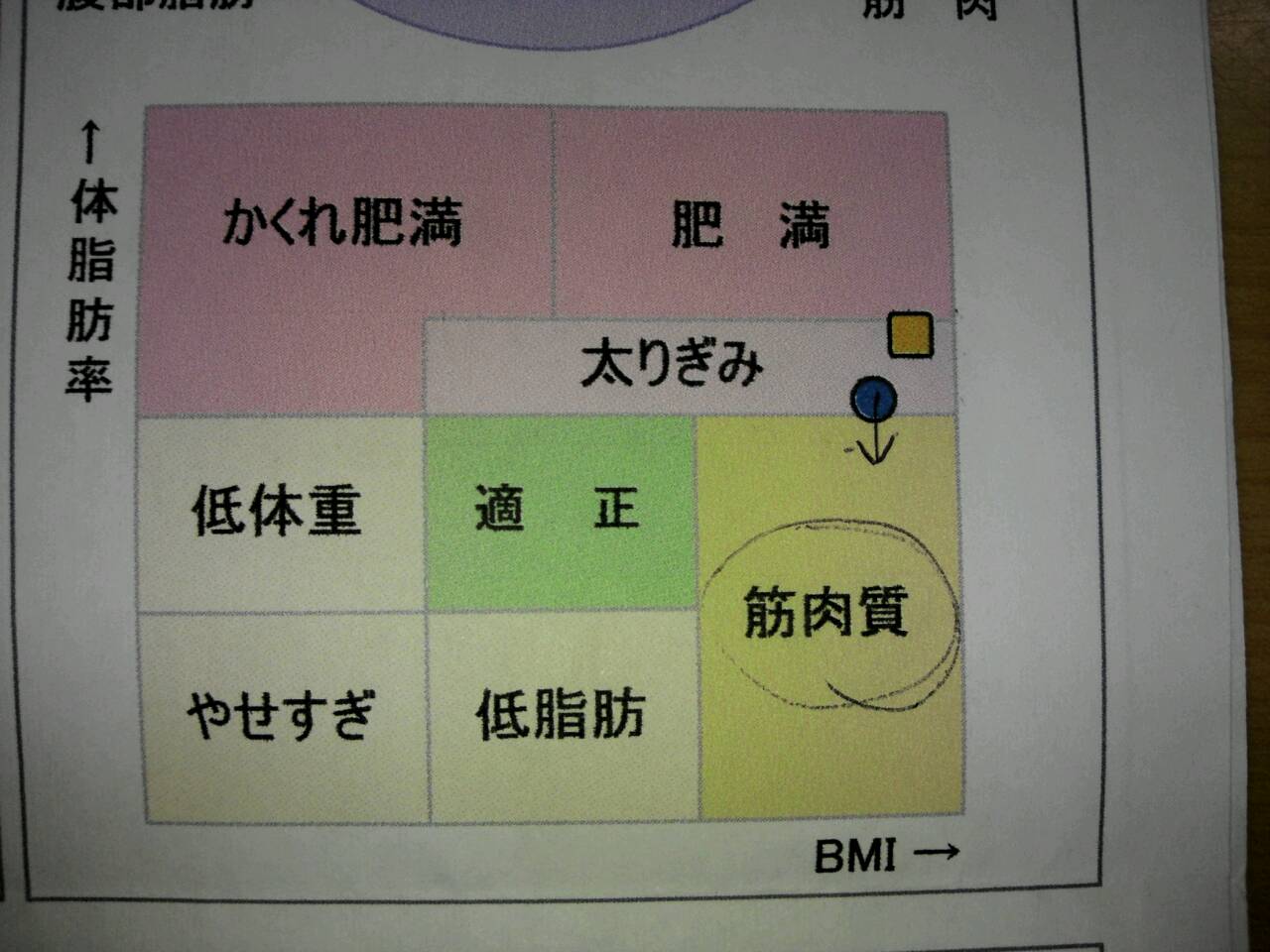 フィットネス(結果) 所員の趣味 2014年08月11日 昨日、3か月ぶりに測定を行いました。ジムの入会時にやったもので体組成測定というやつ。体組成である体水分・タンパク質・骨量・体脂肪量を測定します。そこから、筋肉量や体脂肪量・体脂肪率が分かり。さらに部位別の体組成・バランスもわかります。 結果としては、体重 75.3キロ(前回77.0キロ)筋肉量 56.1キロ(前回55.2キロ)体脂肪量15.8キロ(前回18.6キロ)体脂肪率21.0%(前回24.2%)体脂肪が結構減りました◎最近はウエストもへっこんできましたし良い傾向です。 体脂肪律・BMIから分かる表も「太りぎみ」で肥満の一歩手前だったのが「太りぎみ」だけど、もうちょっとで「筋肉質」です!インストラクターとも少し相談してこれからは、体脂肪量を減らしていくプログラムを取り入れていくことにします。MIZUNO