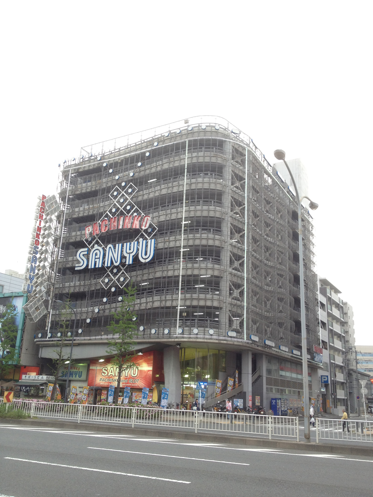 変なビル 所員の発見 2012年06月26日 環状2号沿いに目を引く建物がありましたただのパチンコ屋のビルですが唐突ですがパチンコ屋のタイプとして以下の2つが挙げられます1.駅前などの徒歩圏にある駐車場のないもの(都市部に多い)2.郊外にありやたらと広い駐車場をもつもの(地方に多い)ほとんどのパチンコ屋は2つのどちらかに分類されると思うのですが今回見つけたものは少し違いました都市部に立地+車利用者がターゲット+敷地が狭いという条件が合わさりパチンコ屋の部分よりも上の駐車場のほうが目立ってしまっています駐車場のスロープと外装の簡易さが相まって見事な荒々しさを醸し出しています決して綺麗な建物ではありませんが普通のビルが立ち並ぶ環状2号沿いで異彩を放っていますこういう建物を探しながら街を歩くとけっこう楽しいですiwanami