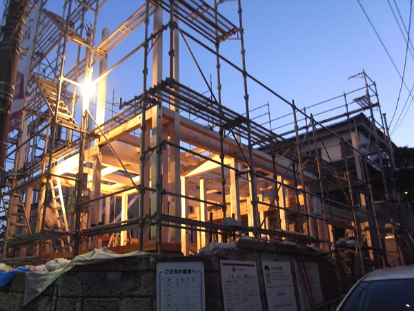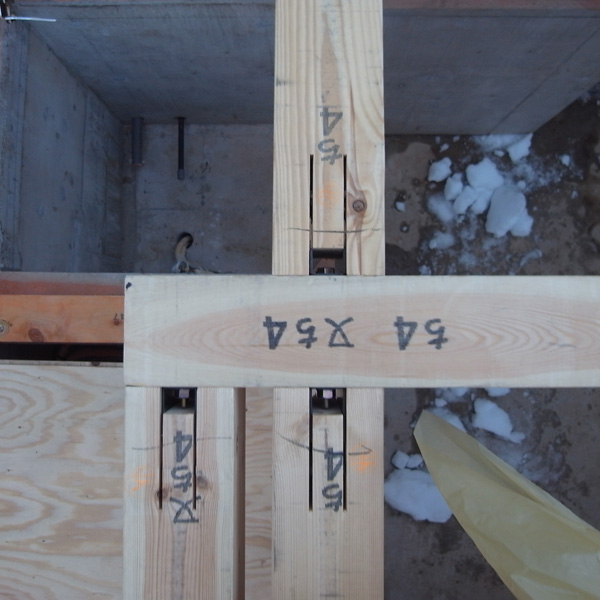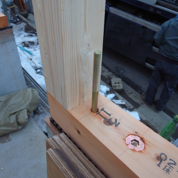 代々木の家(12) 現場報告 2013年01月18日 代々木の家の現場報告です。現場では、建方が始まり、建物の全体像が分かってきました。細かな部分はこうなっています↓木の土台・柱と基礎との緊結の為の金物部分。断面欠損を考慮してボルトとドラフトピンで緊結する接合金物を使った仕口部分。上から見たらこんな感じ。次回は、上棟の現場報告です。MIZUNO PR