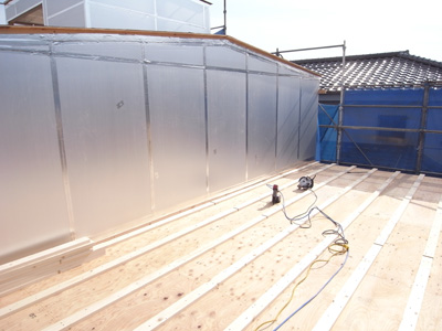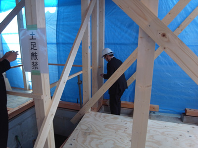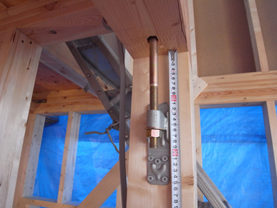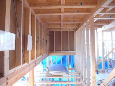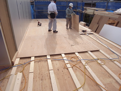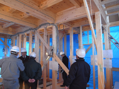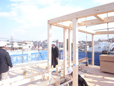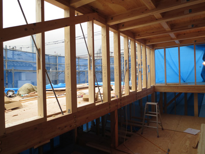 代々木の家(13) 現場報告 2013年02月27日 代々木の家、現場報告です。現場では、現在大工工事が着々と進んでおります。今回は、上棟から先日構造設計者の立ち合いのもと行われた金物検査までの報告です。無事に上棟が終わり、上棟式が施主様立ち合いのもと行われました。塔屋階の屋外テラスのレベルの景色。シロアリから木を守るために防蟻処理を施します。濃い目の色のついている部分が防蟻処理をした部分です。トラス梁。今回は、鋼材の斜材を使ってトラス状に梁を組んでます。トラスとは、橋とかでよく見る三角形を基本単位とした構造形式です。代々木の家では、このトラス梁を採用することで大スパンを支えています。陸屋根の廻りの写真です。通気のための材の上に合板を貼っているところです。外壁の断熱材の写真。(銀色部分)代々木の家は外断熱の仕様としています。この断熱材は表面にアルミ箔の層があり、遮熱性能の高い商品になります。前述のトラス梁部分。ここには、ハイサイドのサッシが取りつく予定です。先日の金物検査の様子。金物の写真。決められた強さの金物がちゃんとついているか等…全数にわたりチェックを行いました。MIZUNO PR