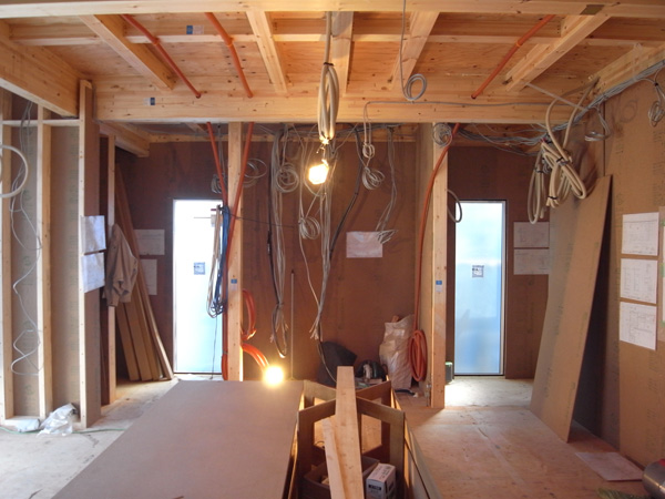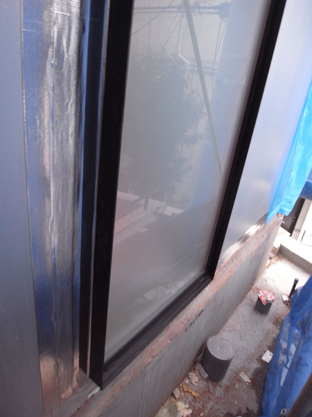 代々木の家(14) 現場報告 2013年03月23日 代々木の家、現場報告です。現場では、外壁・屋根廻りの工事がひと段落して、内側のボードの貼り付け・サッシ取付工事が進められています。リビング部分壁が立ち上がって、内部空間の広さが出てきました。タペストリー(曇りガラス)のサッシも取り付けが完了しています。サッシ外部サッシの廻りには、気密性を確保するために気密テープを四周に施しています。MIUZNO PR