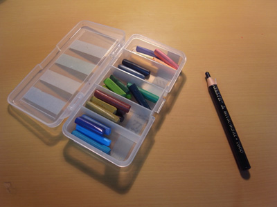 ジュニアの持道具2 ひとりごと 2013年04月04日 以前、「ジュニアの持道具」と題して書いたブログの続編です。今回は、学生時代から愛用しているクーピーと三菱鉛筆の油性ダーマトグラフです。左がクーピー。広い面を塗る時には、横にして使うので3~4cmくらいに折っています。使いやすいように色系統別でケースにしまっています◎適度なグラデーションもつけることができるので重宝してます。どこかに行ってスケッチをしよう!と思った時も出してすぐに使える。キャップも不要。削る必要もない。もう良いところだらけなんです。それとセットで使用しているのが右の側に写っている三菱鉛筆の油性ダーマトグラフ。これクーピーとの相性が抜群に良いんです。6Bとかの濃い目の鉛筆で描いた線にクーピーで着色すると、どうしても芯の粉で黒ずんでしまうのですがダーマトグラフを使用すれば、その問題もなくなります。紙巻タイプなので、これまたナイフや鉛筆削りを使用する必要がない。しかも、強弱のある線が描ける強者です!両方とも、旅行先等で大活躍の代物です。興味がある方は、是非使ってみて下さい。MIZUNO PR