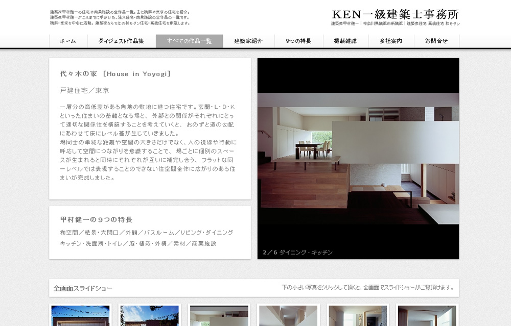HP更新のお知らせ 最新情報 2014年04月18日 ホームページ更新のお知らせです。 すべての作品一覧に「代々木の家」を追加しました。一層分の高低差がある敷地に建つ住宅です。高低差を活かしフラットな同一レベルでは表現することのできない広がりを住空間全体で獲得しようと計画した住宅です。ぜひご覧ください。mogi PR