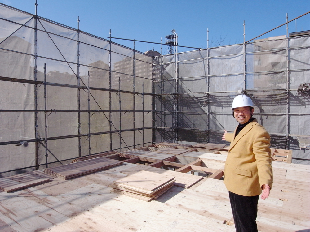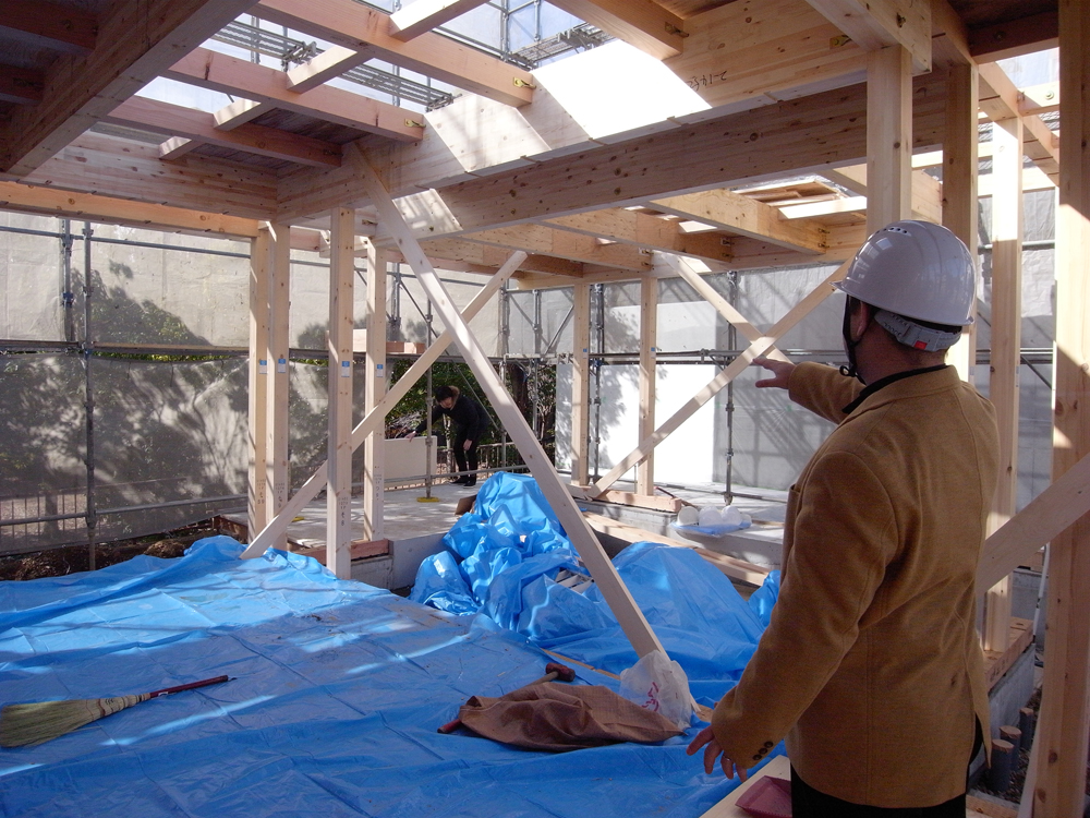 中川の家(10) 現場報告 2015年01月28日 中川の家は今週末の上棟へ向け建方の真っ最中です。 昨日には2階床までがおおよそ立ち上がり、1階は各室が姿を現してきました。 冬でも緑道の常緑から落ちる木漏れ日が非常に美しく、特に2階床レベルからは緑が見渡せて最高に気持ちがよかったです。甲村も子供のように満面の笑みを浮かべていました◎上棟も楽しみです。mogi PR