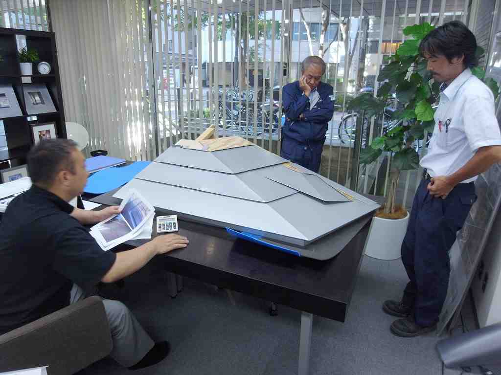 百合ヶ丘の家(2) 現場報告 2015年08月07日 概ねの施工図のめどがたち、詳細を詰める段階まできました。検討した図面をもとに、原寸の屋根のモックアップを作成していただき、打合せを行います。 屋根のコーナー部分のモックアップを作成していただきました。再度検討は必要ですが、実物大の物が出てくると、わくわくします。souhei PR