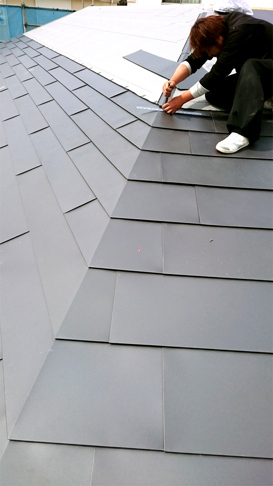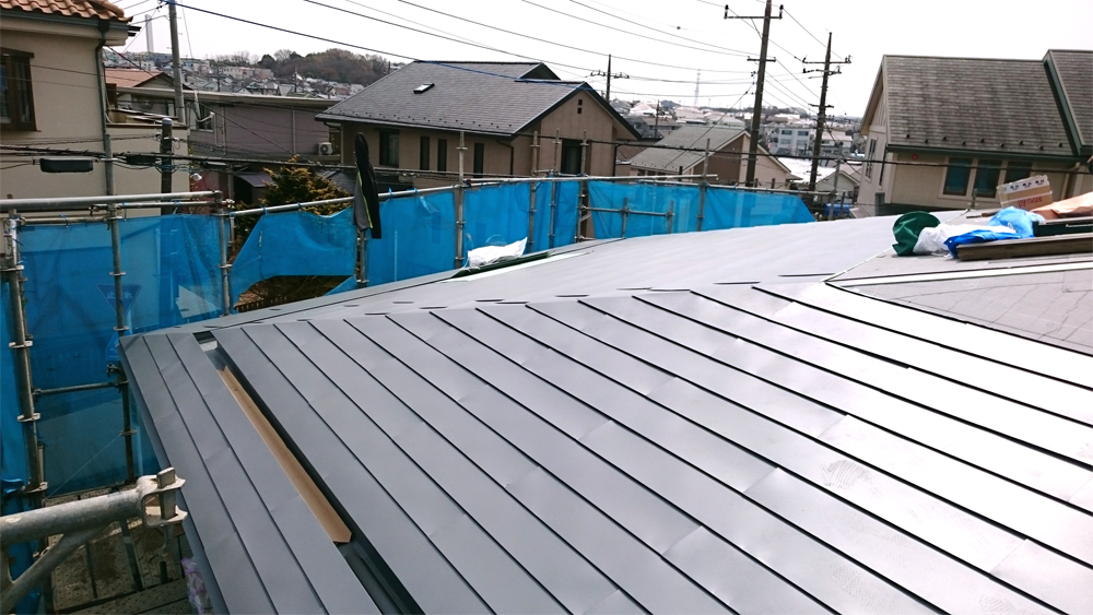百合ヶ丘の家(11) 現場報告 2016年03月23日 外観がとてもシャープな建物になりそうです! 屋根の板金作業が進んでいます。ひとつひとつが手作りなので、大変そうです。なぜ1枚ずつ作るかというと、屋根の墨部分の折れ線をきれいに揃え、屋根をシャープにみせるために、隅部分に屋根カバーを着けない納まりにしているからです。 左:百合丘の家 右:一般的な納まり百合丘の家の場合、屋根の美しさがとても重要なため細かなディテールにもこだわっています。souhei PR
