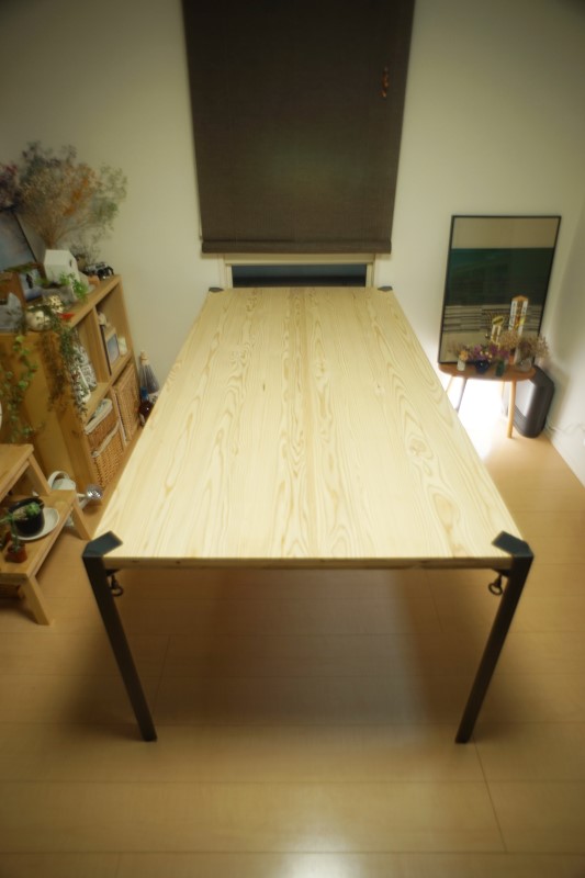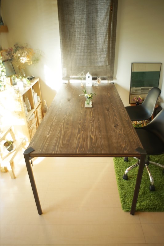 ダイニングテーブル 所員の趣味 2017年09月21日 ダイニングテーブルを新調しました。既製品ではカッコイイかつ安価なものが見つからなかったため脚と天板を別々に購入し、製作しました。 左:塗装前 右:塗装後脚部は広島県のDichotomicが製作しているFCLUMP LEGというアイアン脚です。天板をボルトで締めあげるだけの簡単施工で、どんな板材もテーブルにしてしまう便利な商品です。 天板には厚み36mmのJパネルという建築の構造材にも用いられる杉の3層パネルを3×6板のまま使用しました。無骨な脚と天板の厚み感が相性◎ 天板は3つの粗さの紙やすりで丁寧に磨き、Old Villageのゥォールナット色のオイルステインを2度塗りして仕上げました。久々に自分の手を動かし、モノを作ったことで、改めて職人さんの偉大さが身に沁みました。mogi PR