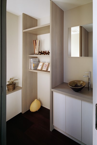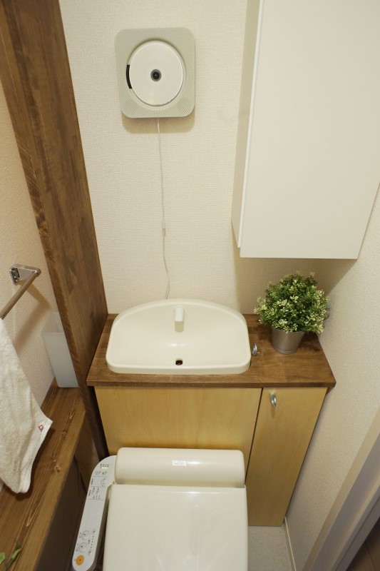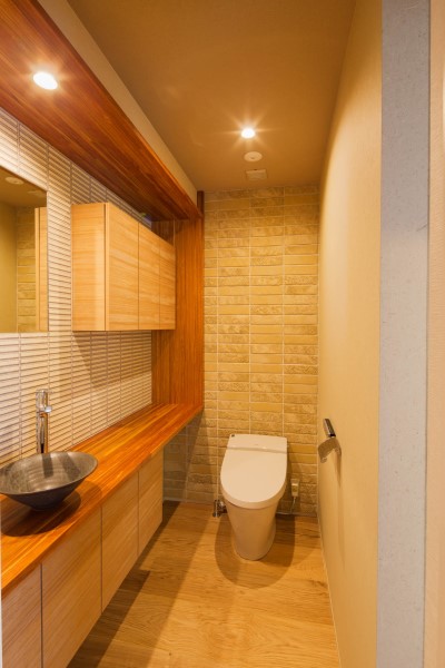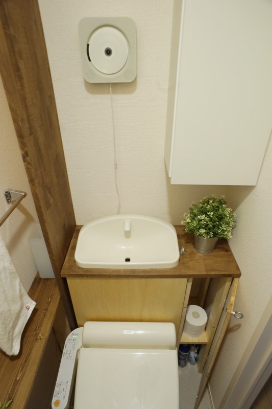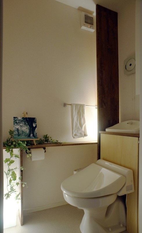 トイレ 所員の趣味 2017年10月10日 日々、仕事で図面を書いているので自宅でも甲村建築の雰囲気を出したくなりまずはトイレの改装を試みてみました。 左:Before 右:After賃貸なので現状復帰が可能な範囲で壁には固定せず、アジャスター等を使って仮固定をしながら、甲村建築でよく用いられる「板の構成」を表現しました。賃貸らしさを出してしまうタンクも隠しました。 参考にした港北の家、代々木の家のトイレ 材料は木工場で切り出してもらい、天板は原寸で型取りし、NCルーターでぴったりと穴をあけしてもらいました。 トイレットペーパーが1セット8個がぴったり入る収納天板のつまみを引っ張ると水が流れます。いかに効率よく材料を使うことでコストを抑えられるかを考えながら図面を書き、実際に自分で加工し、取りつけたことはとても勉強になりました◎mogi PR