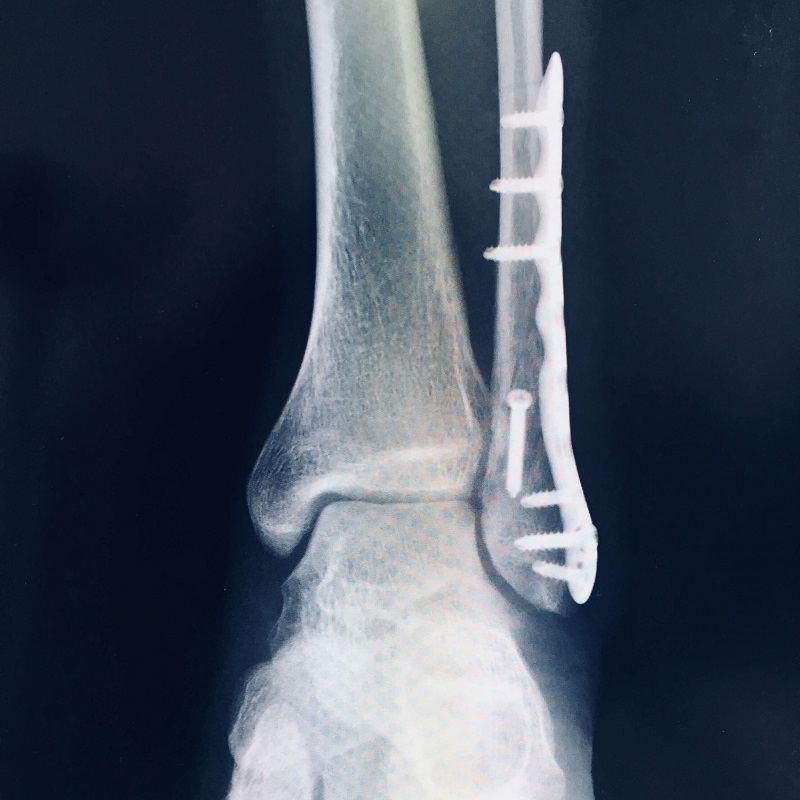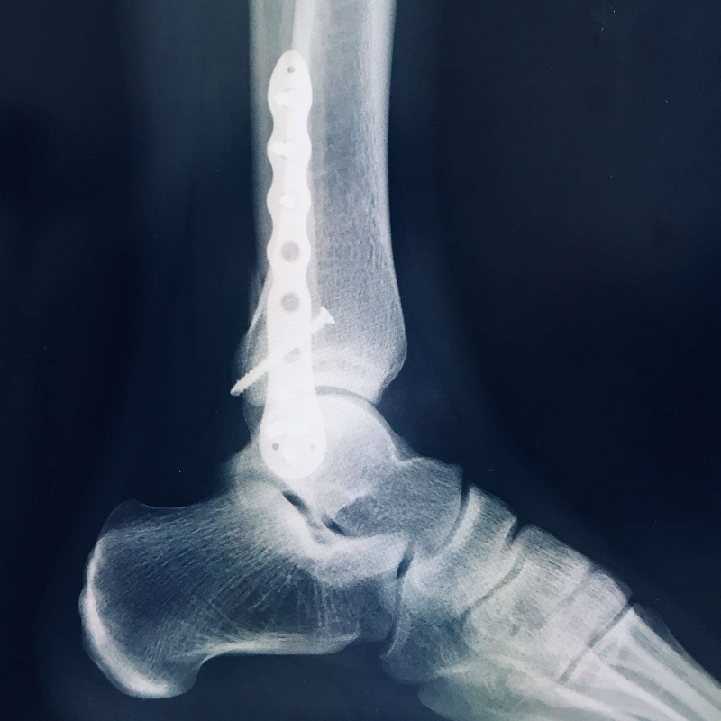 進化論 ひとりごと 2018年02月19日 足首を骨折したのですが、もう歩けるの?とよく言われます。皆さんは松葉杖でギブスしたイメージかもしれませんが、ギブスの代わりに金属プレートを埋め込んだのです。それがこちらです。 なんと、2×4工法で使う構造用金物みたいなものが足に入っているではありませんか。手術後は何があったかはわかっていませんでしたが、このX線を見て、なんだか痛みを感じるような気がします。変化に適応できるものが生き残るのだ。とダーウィンが言いましたが、意外と人間も適応できるものですね。人工的ではありますが。yamamoto PR