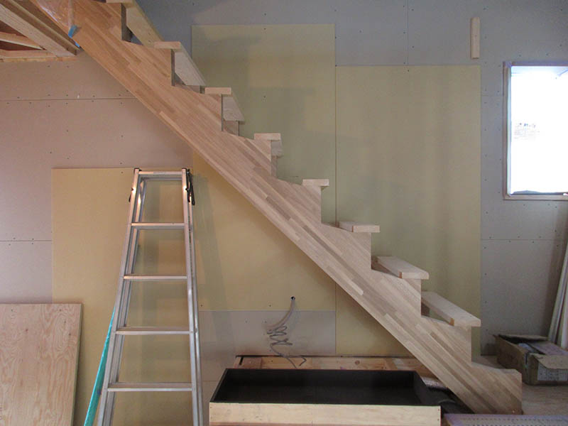 四つ木の家(4) 現場報告 2019年02月21日 四つ木の家は、毎日着々と進行中です。玄関の中で印象的な階段のササラが取付きました。写真の段板(足を乗せる部分)は仮のもの。実際には下のような形状の段板が取付きます。 一部の段板裏には蓋つきの堀込みがあり、そこに手摺を受けるための金物を入れることで、上から見ても、裏から見てもキレイな納まりになります。これは現場監督さんとの打合せの中で生まれたアイデア。現場と設計が互いに協力しながら、四つ木の家は進んでいます!kaisei PR