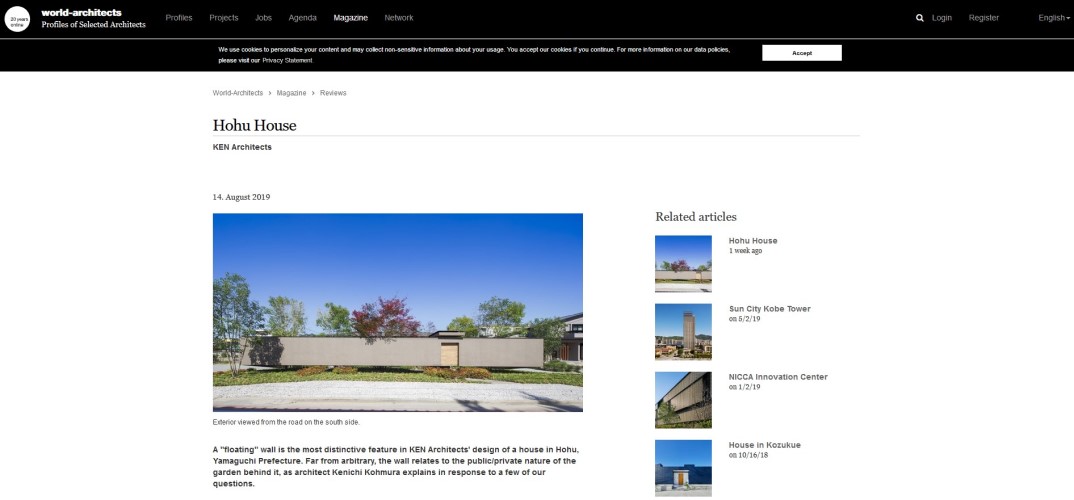 web掲載のお知らせ 最新情報 2019年08月22日 防府の家が webページ World-Architects にHohu Houseとして掲載されました。 日本だけでなく、海外の建築も含めて掲載されているwebページであり、どれも美しい写真ばかりです。担当のNY支局からのコメントで「こんなにも美しい住宅が世界に公開されることが衝撃です」とのコメントを頂きました。ぜひご覧ください。yamamoto PR