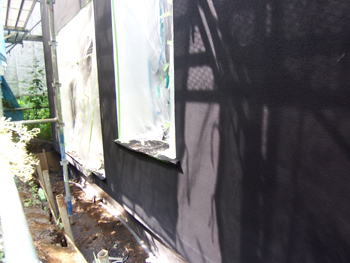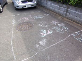 茅ヶ崎の家 現場報告 2008年09月06日 <茅ヶ崎の家>は外壁の塗壁仕上げの施工中です。昨日は下塗り材の吹き付けがほぼ終わっていて、上塗り材を外壁に表情を付けるようにコテで押えながら塗っているところでした。天気が良く日差しも強かったのでちょっと明るい色に見えますが、実際は塗り壁メーカーで製造できる最大限濃い色の黒を採用しています。写真で白く見えている部分は外壁面よりも奥まったところに設けた開口部廻りです。外壁面の「黒」とコントラストをつけることで開口部廻りが軽やかに見えるようにしています。内部は仕上げや建具等の下準備中でした。一通り見て帰ろうと車に向かっていると道路に子供が書いた落書きがありました。楽しそうです。by tamura PR