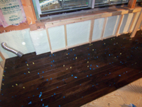 王禅寺の家(8) 現場報告 2009年04月17日 1階の無垢フローリングが張られ始めました。アカシアという、ウォルナットのような濃い色の樹種です。無垢材は熱や湿気で収縮・膨張するので材同士の間に厚紙の厚さ程度の隙間を空ける必要があります。なので写真ではわかりにくいですが、隙間を空けるためのスペーサーを挟みながら張っていきます。ちなみに2階も同じく無垢フローリングで濃い色のものを採用していますが、こちらは床暖房を使用するので、反りにくくなるように熱処理が施されたアッシュ材のフローリングを採用しています。木を燻製にしたような深みのある色をしているので張られるのが楽しみです。by tamura PR