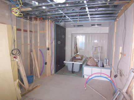 みなとみらいの家(3) 現場報告 2010年10月15日 ユニットバスの取り付けがほぼ終わりに近づいています。工事前から、取り付けをとても楽しみにしていました。今回使用するユニットバスはとても特徴的です。特注で、自由な形で計画でき、浴槽から、水栓関係の金具そして仕上げまで自由に選択することができます。一般的なユニットバスのようなツルピカ感は全くありません。全てタイルで仕上げられ、空間はとても質感があり、落ち着きます。写真の反対側には大開口を通した、横浜湾の景色が広がっています。想像するだけで、心が癒されてしまいます。shimada PR