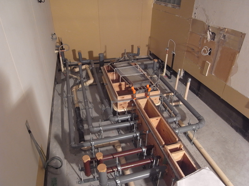 濱壹(厨房内工事・床編) 現場報告 2010年11月03日 今回は厨房内の工事についての現場報告です。今回のような改修工事では客席の床面より高くなります。なぜかというと・・・厨房内の床下は、ガスや水道給湯、排水の為の配管など厨房設備の為に必要なスペースだからです。上の写真の中央にある長細いもの(今は木で覆われてる)はシンクなどから出た排水の為の排水溝です。その奥にある大き目のボックスはグリーストラップと呼ばれる排水水の中の油をとる装置です。グリーストラップの中はこんな風になってます。この装置がないと配管に油が付着し、スライム化して配管が詰まるなど大変なことになってしまうので今は設置が義務付けられてます。各種配管が終わるとスタイロフォームという断熱材が敷き詰められモルタルが打設されます。写真はすでに養生されている状態なのでコンクリートの面は見えてません・・・この状態ですでに排水溝に向かって下がり勾配がつけられており水はけが良いようになっています。もちろん配管関係もニョキニョキとでております!土間が打設されて厨房も大分と形が見えてきました!MIZUNO PR