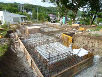 鴨川の家(3) 現場報告 2011年08月08日 現場では、基礎の配筋作業が進んでいます。土地に傾斜があるため、基礎底盤に段差のある形状としています。今後は、型枠を組みコンクリートの打設を行います。by koji PR