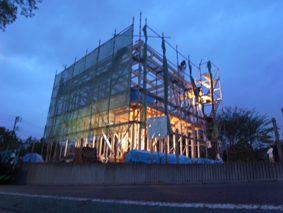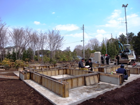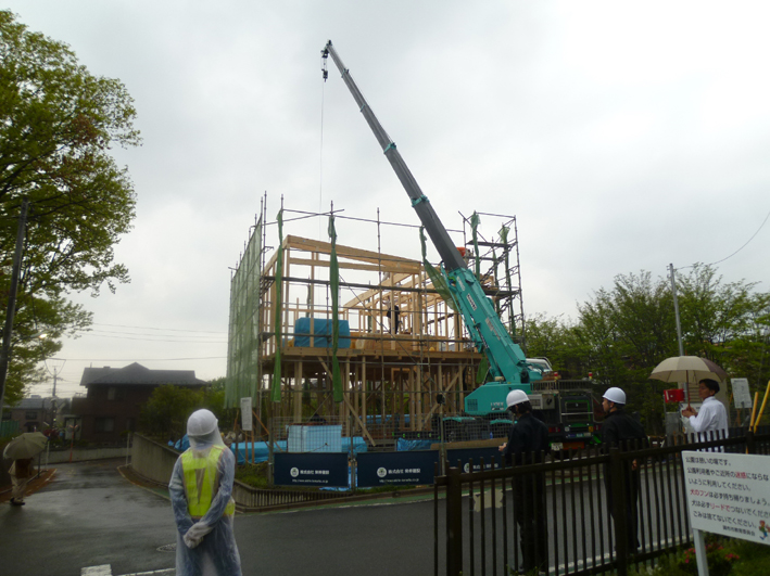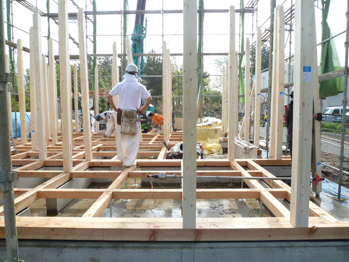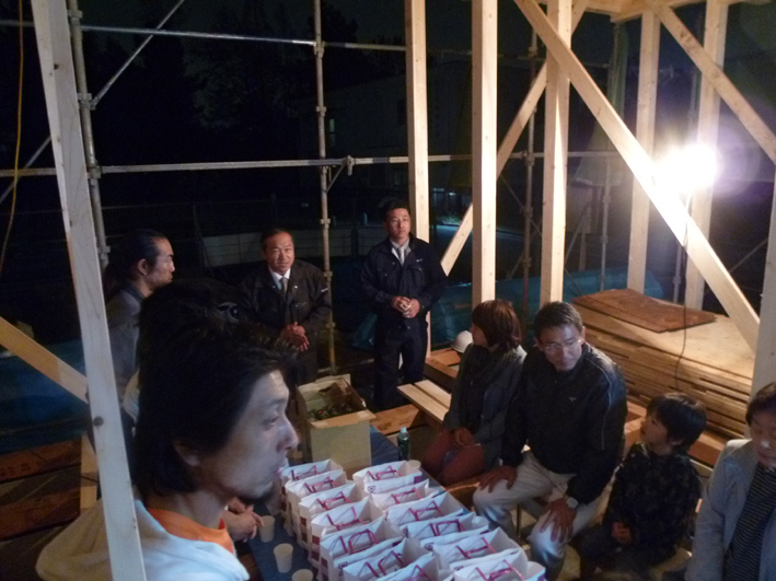 調布の家(2) 現場報告 2012年04月28日 まずは前回の続きから、基礎打設から次はアンカーボルトの確認です。基礎業者さんの精度もよく、いい仕上がりです。休憩時には基礎の型枠が即席のベンチに早代わりしています。そして土台敷き、アンカーボルトのずれも無く、大工の棟梁も土台のド芯に来てるおっしゃっていて、施工しやすそうでした。そして木造でのメインイベントの一つである上棟式へまずは1階の柱を建てることから始まって、2階の床組みまで終わると上の写真のような感じ、いつ見てもこの床組みの感じはちょっと爽快な感じがして好きです。ただ、今回の計画は、木造でありながら、2階の外周全てが、跳ねだしているので、ここまでにたくさん時間がかかりました。途中雨の降った影響も有り、予定の時間より遅れて全体像が見えてきました。一日で全体の雰囲気が感じられるのが、木造の醍醐味の一つです。上棟式をやる頃には辺りは真っ暗に、暗くなっても、途中で仕事を切上げず、責任を持って仕事を進めてくれた大工さんには感謝です。これからも怪我なく、順調に工事は進んでいっていただきたい限りです。yamaおまけ骨組みだけでライトアップされるとなんだかカッコイイです。 PR