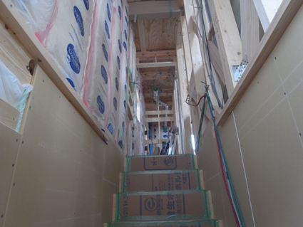 大倉山の家(9) 現場報告 2011年04月21日 現場では階段が組みあがりました。大工さんの上手な施工で、とてもきれいな仕上がりとなっています。今は養生をしていますが、養生がはがれたときがとても楽しみです。yama