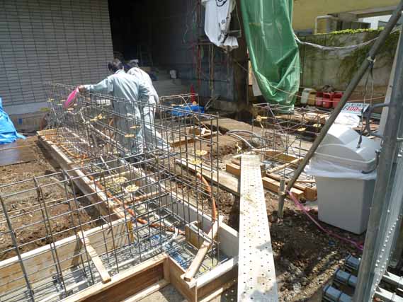 田園調布の家(18) 現場報告 2011年04月22日 現場では、外構工事が進んでいます。写真は、外構壁の配筋作業の模様です。アプローチ部分は、建物本体の構成をモチーフにしてうまく調和するようにデザインしています。by koji
