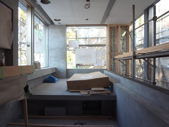 フォレストハウス(11) 現場報告 2010年12月15日 現場では、内装下地工事がほぼ終わりを向かえ、今後は、仕上げ工事に入ります。写真は、3階の浴室です。3方向を緑に囲まれたまるで宙に浮いたような開放的な空間となっています。by koji