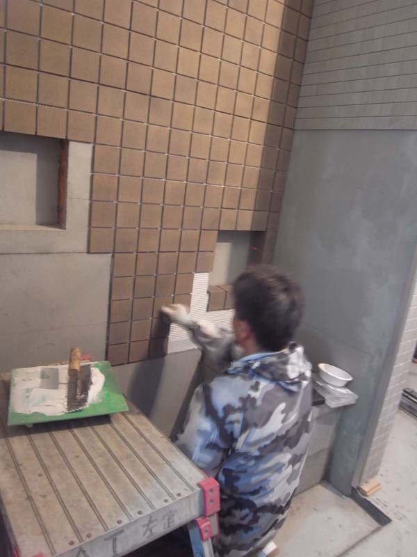 フォレストハウス(12) 現場報告 2010年12月22日 現場では、仕上げ工事が進んでいます。写真は、タイル張り作業の模様です。事前に検討したタイル割り図面に基づいて一枚一枚、慎重に張り進めています。竣工まで、あと一ヶ月半工事は急ピッチに進んでいきます。BY KOJI PR