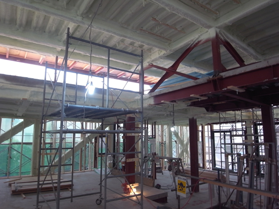 田園調布の家(10) 現場報告 2010年12月08日 現場では、外気に面する鉄骨部材への発泡ウレタン(断熱材)の吹きつけ工事が進んでいます。鉄骨はとても冷えやすい材料なので隙間なくしっかりと断熱材でくるむことがとても重要になります。発泡ウレタンは、液体の原液を吹き付けるとたちまち泡状にふくれあがり硬化する特性があるので入り組んだ部分の多い鉄骨部材には最適です。BY KOJI PR