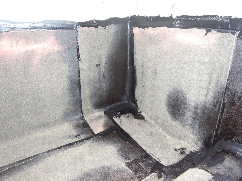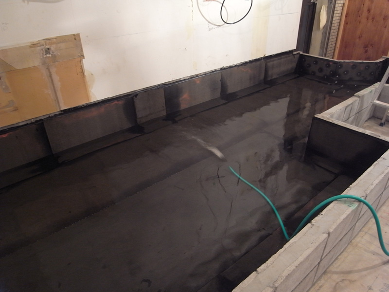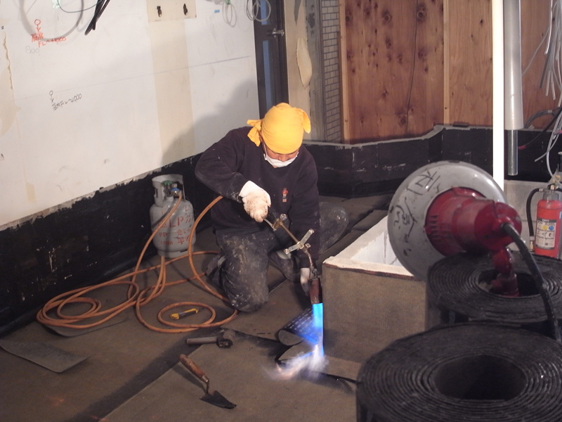 濱壹(防水工事完了) 現場報告 2010年10月24日 今回は、この前立ち上げたブロック内の防水工事です。本工事では、改質アスファルトシートを使ったトーチ工法による防水です。どういう工法かというとまず、トーチバーナーというバーナーで防水シートを炙ります。するとシートの裏面が溶けてネバネバっとしてきます。その粘着力でもって、シートを張っていくという工法です。施工後はこのようになります。隅の部分は、隅の部分は水が漏れやすいので念入りにやります。工事が終わると次は水を張って試験。防水を施した部分を水で満たし漏れがないかの最終チェックです。MIZUNO