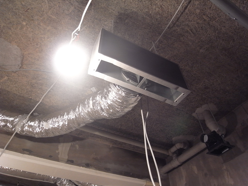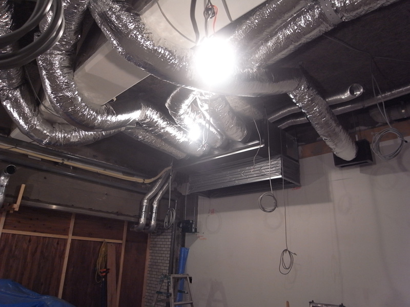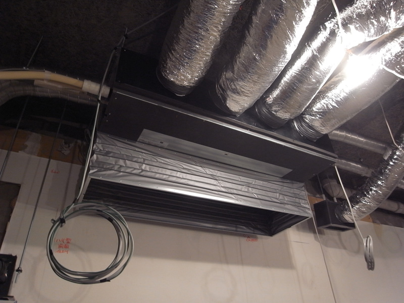濱壹(空調機取り付け) 現場報告 2010年10月23日 墨だしが完了し現在、天井部分の工事をしています。まずは空調機の取り付けこれが今回客室で使用する空調機です。この大きいボックスの下から空気を吸込み写真にある銀色のダクトを通して各部屋に空気を送ります。タコの足のようですね。そして、このボックスから空気が出ます。もちろん、このボックスが室内にでてくるのではなくフェイスだけが店内から見えてきます。普段、なんにも気にしない天井の中ですが設備に係る大切なものがたくさん詰まっているのですね。MIZUNO