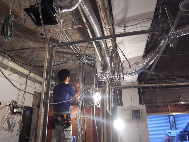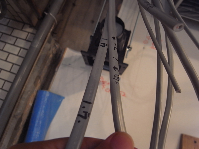 濱壹(配線工事) 現場報告 2010年10月25日 空調機の取り付けに続き天井部分では照明や換気のための配線工事が進んでいます。パッと見てはどれがどの配線か全く分かりません。食いしん坊の私なんかは駄菓子屋さんにある糸にアメが付いているお菓子を連想してしまいます。ちなみにこれは糸ひきアメというらしいです。実際には、配線の端にどこの配線かがしっかり書かれており間違えないようになっています。糸ひきアメもこんな風に書かれていたら大きなアメがとれたのにな~なんて、またまた変な想像をしていました・・・MIZUNO