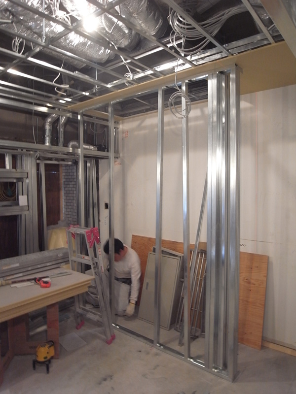 濱壹(天井・壁下地組) 現場報告 2010年10月27日 天井の配線に続きまして、現在は天井や壁を建てるための骨格となる下地が組まれています。下地には、木を使用した木下地などもありますが今回は、LGSという軽量鉄鋼を使用します。LGSの下地は天井、床にランナーとうコの字型の部材を取り付け◎ランナー(床についているのがランナーです)その間に、スタッドと言われる縦部材を建てていきます。◎スタッド(今回は、四角スタッドを多く使用してます)こうして、壁が出来上がっていきます!現場では、下地がほとんど終わり全体像が浮き彫りに!日に日に、出来上がっていく現場に、もう目が離せません。MIZUNO