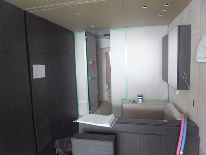 みなとみらいの家(4) 現場報告 2010年10月29日 ようやく家具がほぼ取り付けおわりました。家具は中国製の家具なのですが、とてもきれいで、そして、とても精度がよく、㎜単位の下地にぴたっととりついてきます。だいぶ、室内の印象が、完成形に近づいてきました。毎度、毎度現場の玄関を開ける瞬間が楽しみになってきます。来週から、クロス、タイル工事がはじまります。再来週末は器具の取り付けそしてフィニッシュです!再来週よりみなとみらいで国際会議APECが開かれます。そのための交通規制がどこまで施工に影響を及ぼすのか。ここ最近、あたりの警備がひどく、一般のひとより警察官のほうが多いのはいうまでもありません。物々しい雰囲気が漂っています。気がかりです。shimada