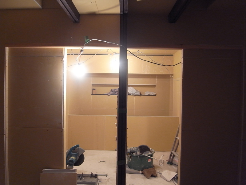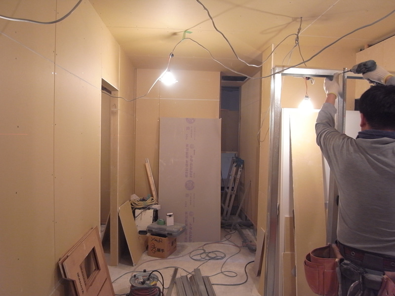 濱壹(PB貼り完了) 未選択 2010年10月30日 LGSの下地の工事に続きまして現場では、石膏ボードというボードの貼る作業が進みほとんどの壁が立ち上がっています!ちなみに石膏ボードというのは強度や防火性能に優れていまして内装の壁下地材として建築材料で頻繁に使用する材料の一つです。ボード貼りと並行してニッチの天板や鴨居なども取り付けられています。全体像がなんとなく分かってきましたね。今は、全ての壁がPBのままで同じ色ですがこれから、このボードにクロスを張るなどしてお化粧していき綺麗な空間へと成長していきます。MIZUNO PR