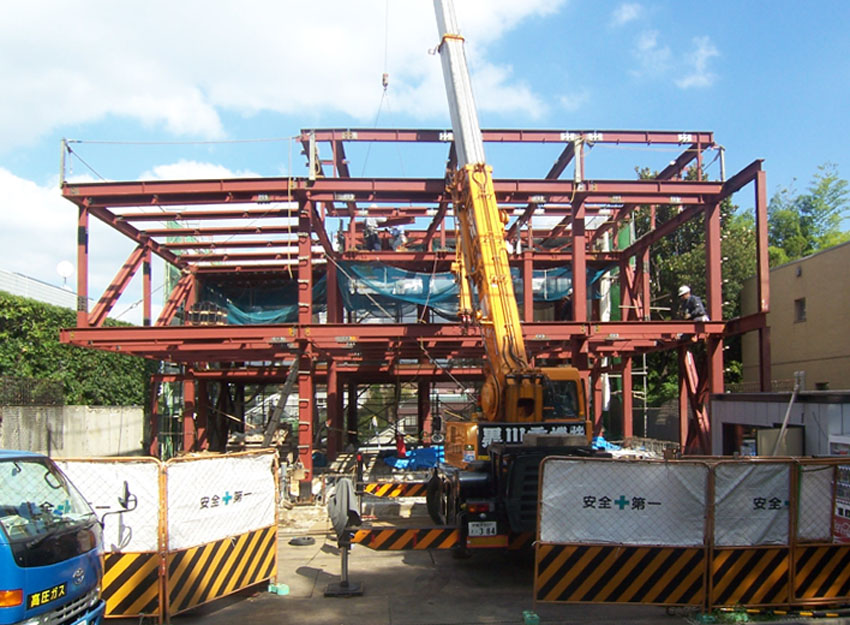 田園調布の家(8) 現場報告 2010年10月05日 残されていた、建物前半分の鉄骨が立ち上がりました。これで、やっと建物全体の鉄骨建て方工事が完了となります。まだ、骨組みが組まれただけの状態ですが、建物の姿に、しばし感動に浸ってしまいます。by koji PR